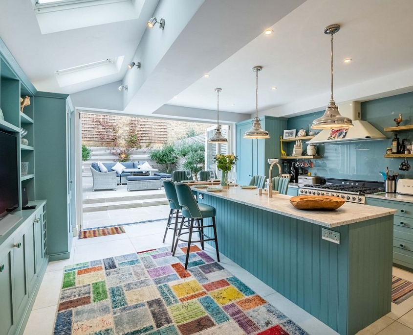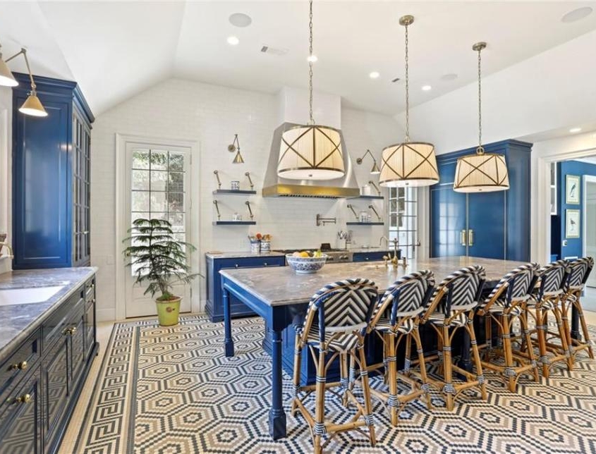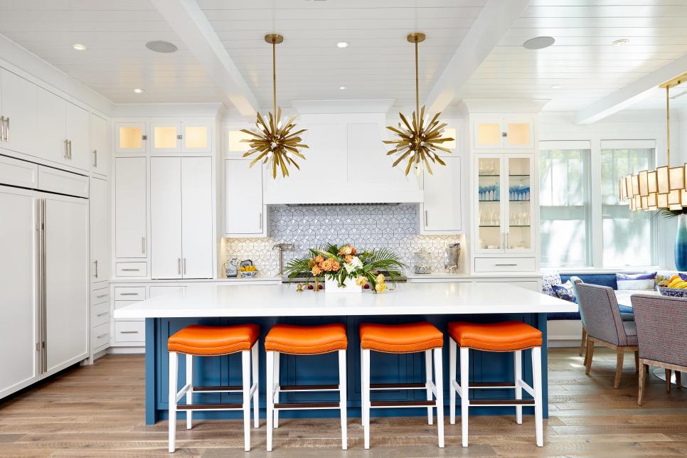 Find inspiration on adding blue accents in the form of kitchen bar stools, lighting, tiling, paintwork, artwork and more